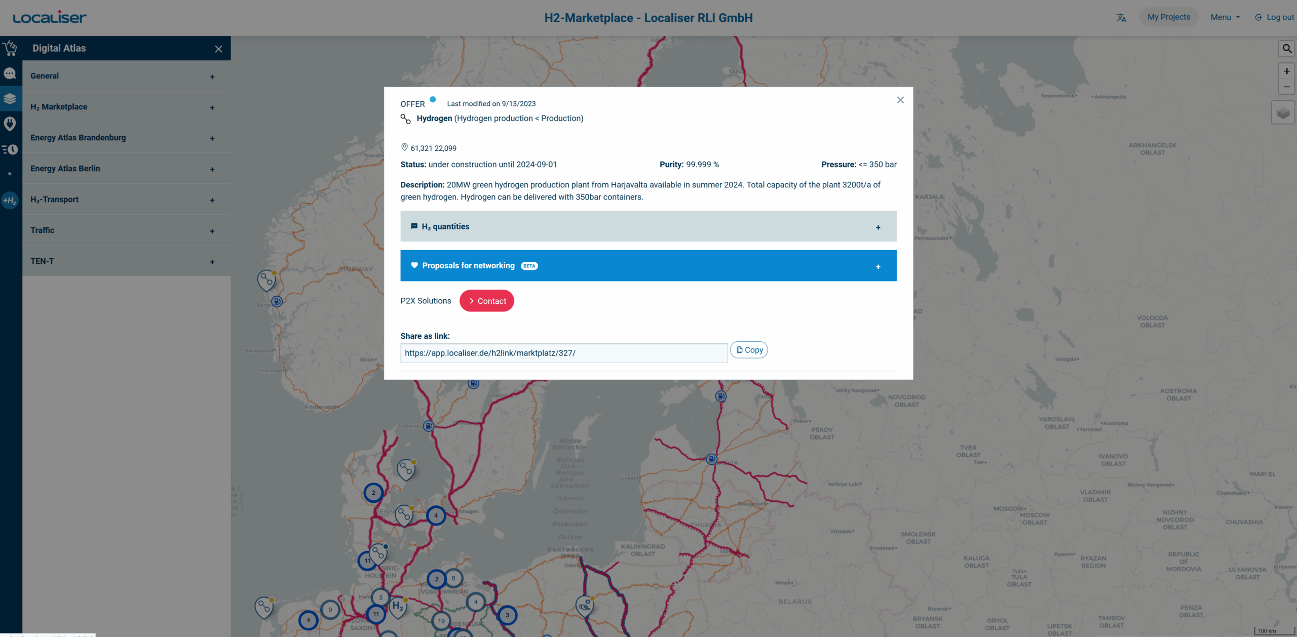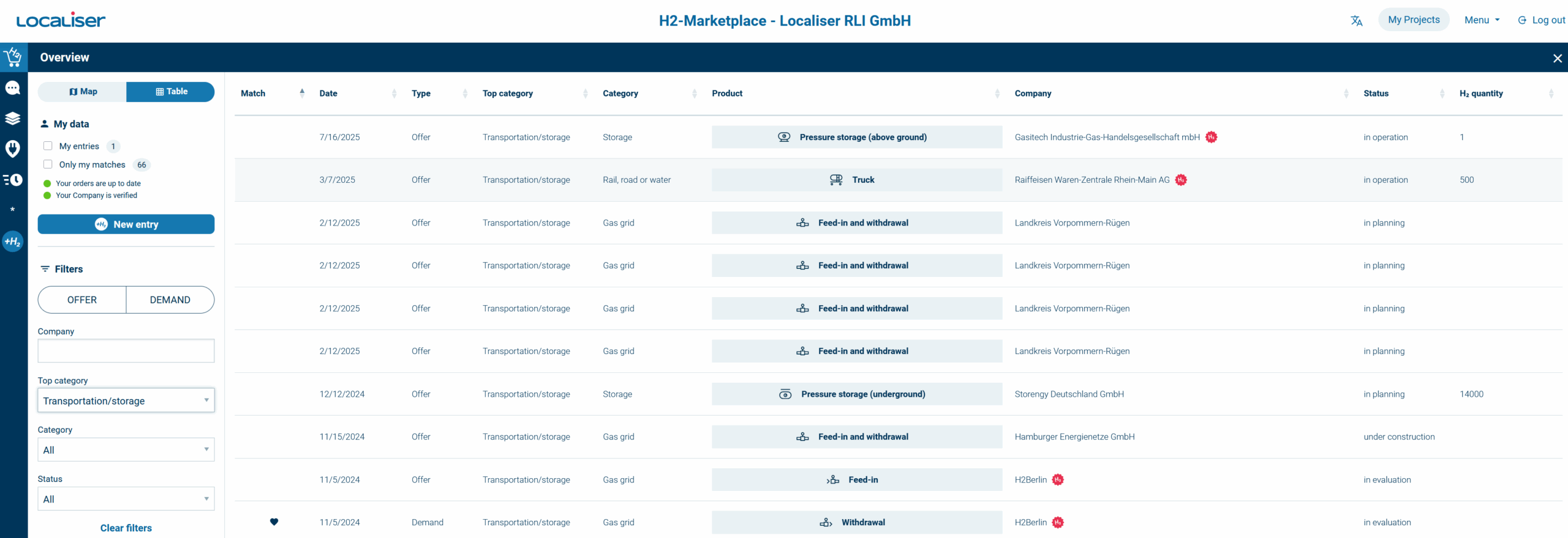 The H₂ Marketplace by Localiser is the leading web-based platform to connect the entire hydrogen value chain from producers and consumers to infrastructure planners, technology providers, and service companies. The platform is completely free of charge and already brings together more than 700 companies in Europe.
