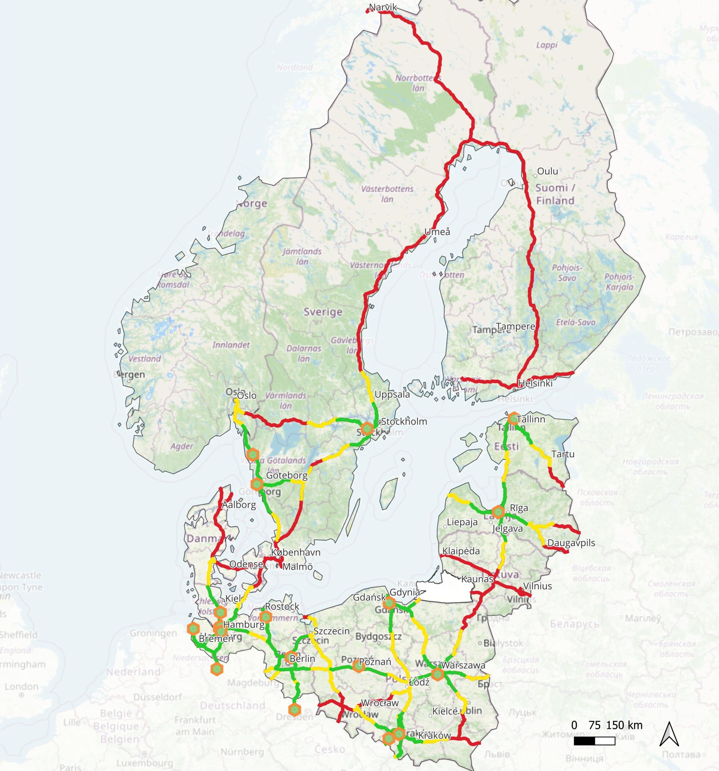 As of today, there are about 20 hydrogen refuelling stations in operation in the Baltic Sea Region suitable to serve heavy duty transport along the TEN-T core road network. Situation is steadily improving, since several HRS are under construction. However, the current HRS infrastructure is leaving major gaps with distances of more than 100 km (yellow) or more than 200 km (red) to the nearest HRS can be observed in the far North, in Denmark and in part of the Baltic Countries.
