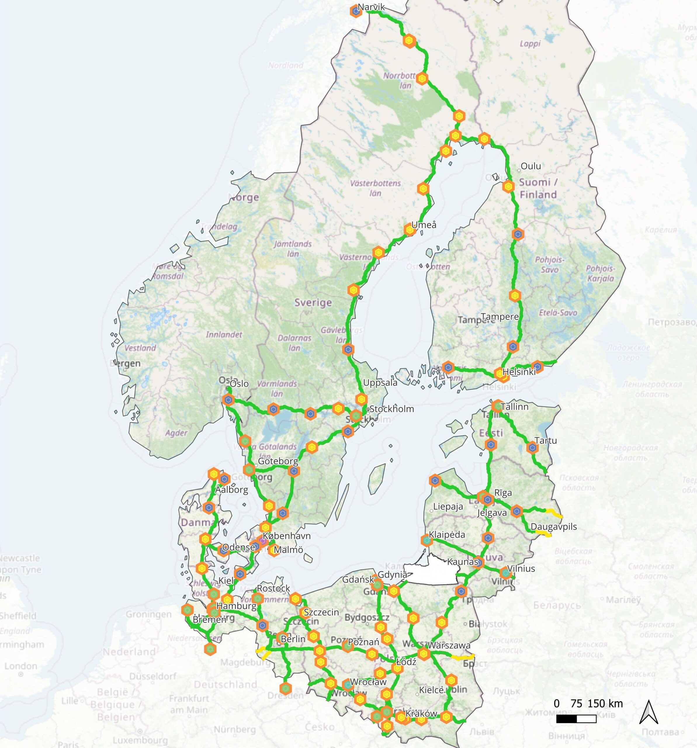 Based on the HRS suggested by the regional spatial development concepts elaborated for Greater Rostock region, Wielkopolskie region, Kaunas and Panevezys regions, Vidzeme region and Helsinki region, HyTruck suggests to locate additional hydrogen refuelling stations at sections of the TEN-T network, where currently no HRS are being planned. A total of 23 HRS is suggested to be built in addition to already existing and planned ones. This would result in a maximum distance of 200 km inbetween two hydrogen refuelling stations, thereby fully complying with AFIR.